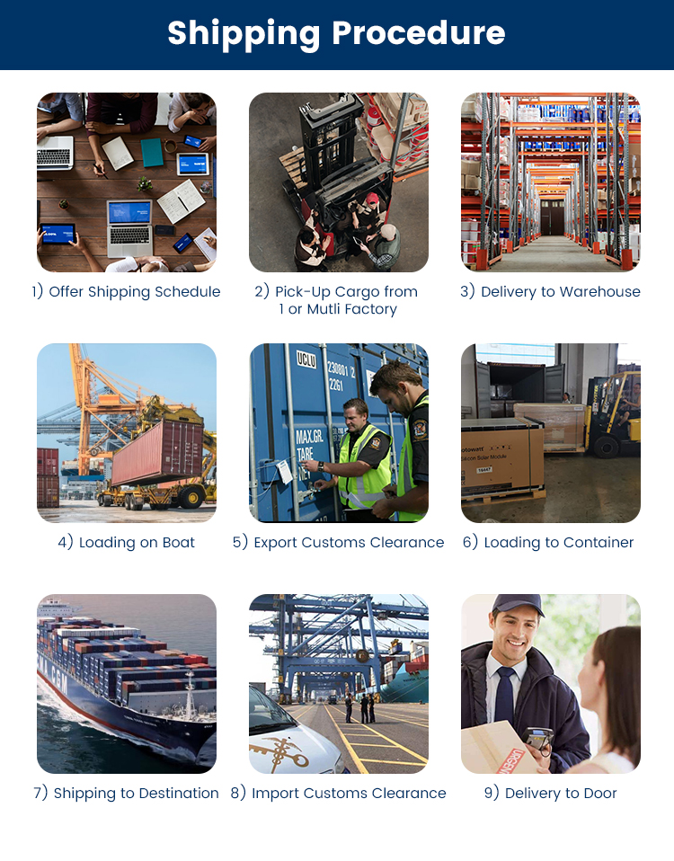 1) FREE Storage FREE Consolidation FREE FBA Requirement Check 2) Customs Brokerage 3) Commodity Inspection 4) Documentation Service 5) Warehouse Service 6) Repacking Service 7) Shipping Insurance 8) Quality Checking Service 9) Consultation Service |