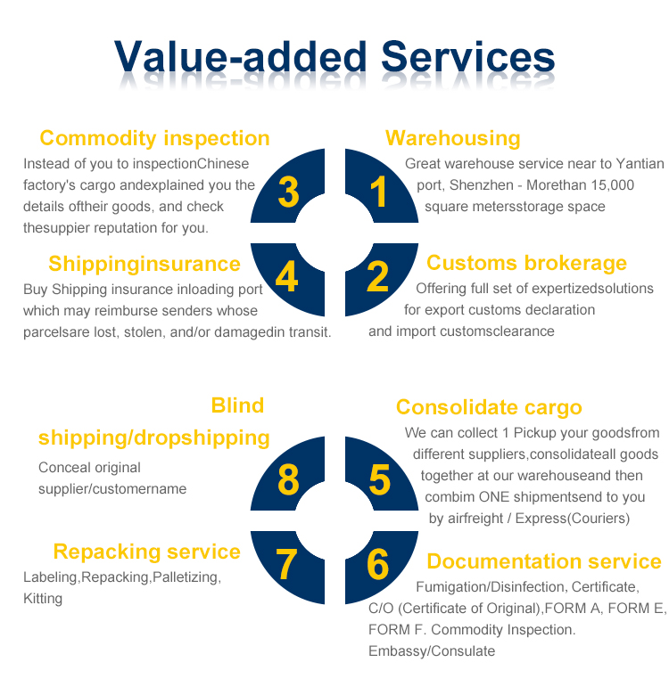 - Value -added service : Warehousing:Cargo collection,Palletization,Storage,Labeling,Packing